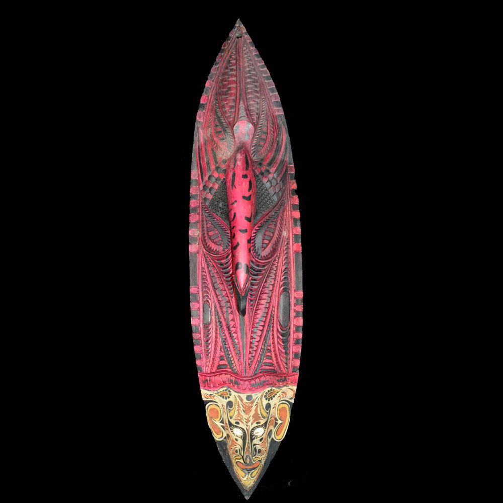 According to the villagers this style of mask came to a man from Sego Clan in a dream. For a long time only members of that clan were allowed to carve them. They later granted permission to use the style to member of the other clans. This wonderfully carved and painted mask has a totemic bird on the top. It is 27.75 inches tall.